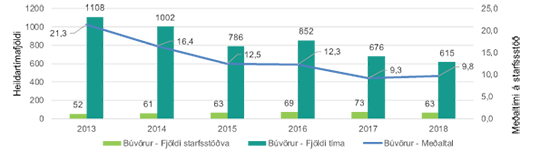 Af framangreindu línuriti má sjá að tímum sem áætlaðir eru til að sinna reglubundnu eftirliti með kjötvinnslum, mjólkurbúum og sláturhúsum hefur fækkað úr 1.108 tímum árið 2013 niður í 615 tíma árið 2018, þrátt fyrir að starfstöðvum hafi fjölgað um 11. Þó tekið sé tillit til þess að hluti fjölgunarinnar hafi verið í smærri vinnslum þá fer áætlaður fjöldi tíma í eftirliti á hverri starfsstöð að meðaltali úr 21,3 klst. niður í 9,8 klst. Eins og við á um lagarafurðir hefur rauntími í eftirliti með búvörum einnig reynst lægri en áætlanir gerðu ráð fyrir.