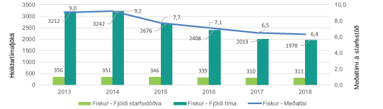 Af framangreindu línuriti má sjá að tímum sem áætlaðir eru til að sinna reglubundnu eftirliti með fiskvinnslum hefur fækkað úr 3.212 tímum árið 2013 niður í 1.978 tíma árið 2018. Þrátt fyrir að hluta af skýringunni megi rekja til fækkunar starfstöðva um 63, þá hefur áætlaður meðal tímafjöldi í eftirliti með fiskvinnslum farið úr 9 klst. niður í 6,4 klst. Þess ber einnig að geta að rauntími í eftirliti hefur reynst lægri en áætlanir hafa gert ráð fyrir.