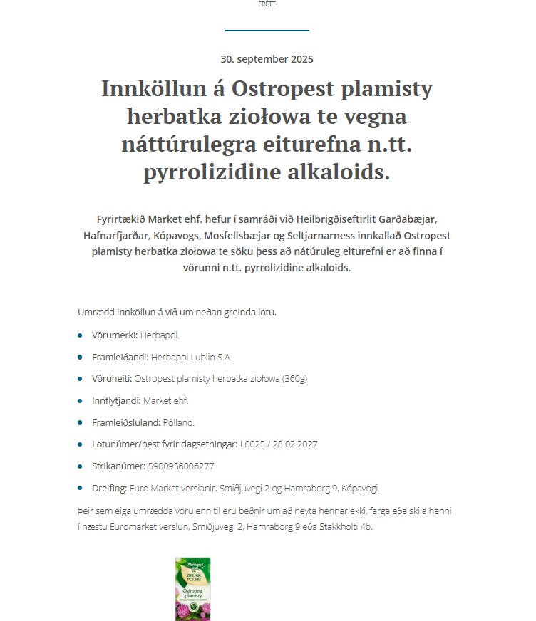 Matvælastofnun varar við einni framleiðslulotu af Herbapol te vegna náttúrulegra eiturefna (pyrrolizidine alkaloids) sem Market ehf. flytur inn. Fyrirtækið hefur í samráði við Heilbrigðiseftirlit Garðabæjar, Hafnarfjarðar, Kópavogs, Mosfellsbæjar og Seltjarnarness innkallað vöruna.