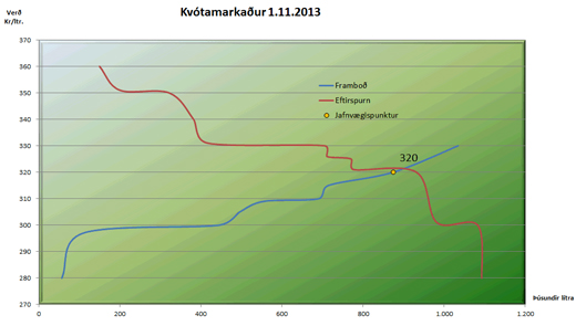 Á meðfylgjandi mynd má sjá niðurstöðu tilboðsmarkaðar þann 1. nóvember 2013. Á myndinni er sýnd blá lína framboðs og rauð lína eftirspurnar. Jafnvægisverð sem fram kom á markaðinum reyndist krónur 320 kr/l.