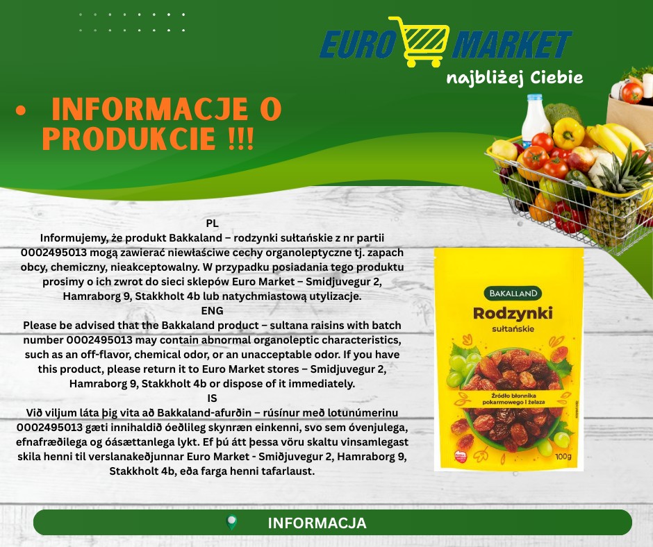 Matvælastofnun upplýsir um innköllun á Bakalland sultan rúsínum vegna óeðilegrar lyktar og bragðs sem Market ehf. flytur inn. Fyrirtækið í samráði við Heilbrigðiseftirlit Garðabæjar, Hafnarfjarðar, Kópavogs, Mosfellsbæjar og Seltjarnarness-HEF hefur innkallað vöruna.